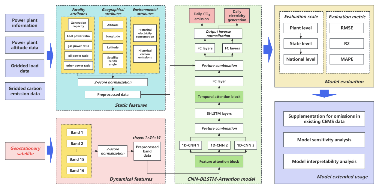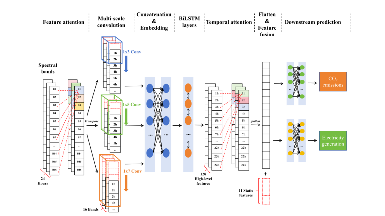 研究以美國(guó)環(huán)保署(EPA)管理的火電廠(chǎng)為研究對(duì)象,采用GOES-16地球靜止衛(wèi)星提供的多光譜遙感數(shù)據(jù)及火電廠(chǎng)相關(guān)靜態(tài)信息作為模型輸入,以火電廠(chǎng)日尺度的碳排放與發(fā)電量數(shù)據(jù)為預(yù)測(cè)目標(biāo),構(gòu)建端到端的監(jiān)測(cè)框架(圖1)。在算法設(shè)計(jì)上,模型融合了卷積神經(jīng)網(wǎng)絡(luò)(CNN)、雙向長(zhǎng)短期記憶網(wǎng)絡(luò)(BiLSTM)和特征與時(shí)間雙重注意力機(jī)制(圖2),顯著提升了模型測(cè)算的準(zhǔn)確性與魯棒性。