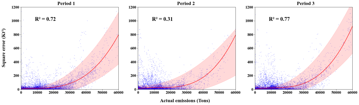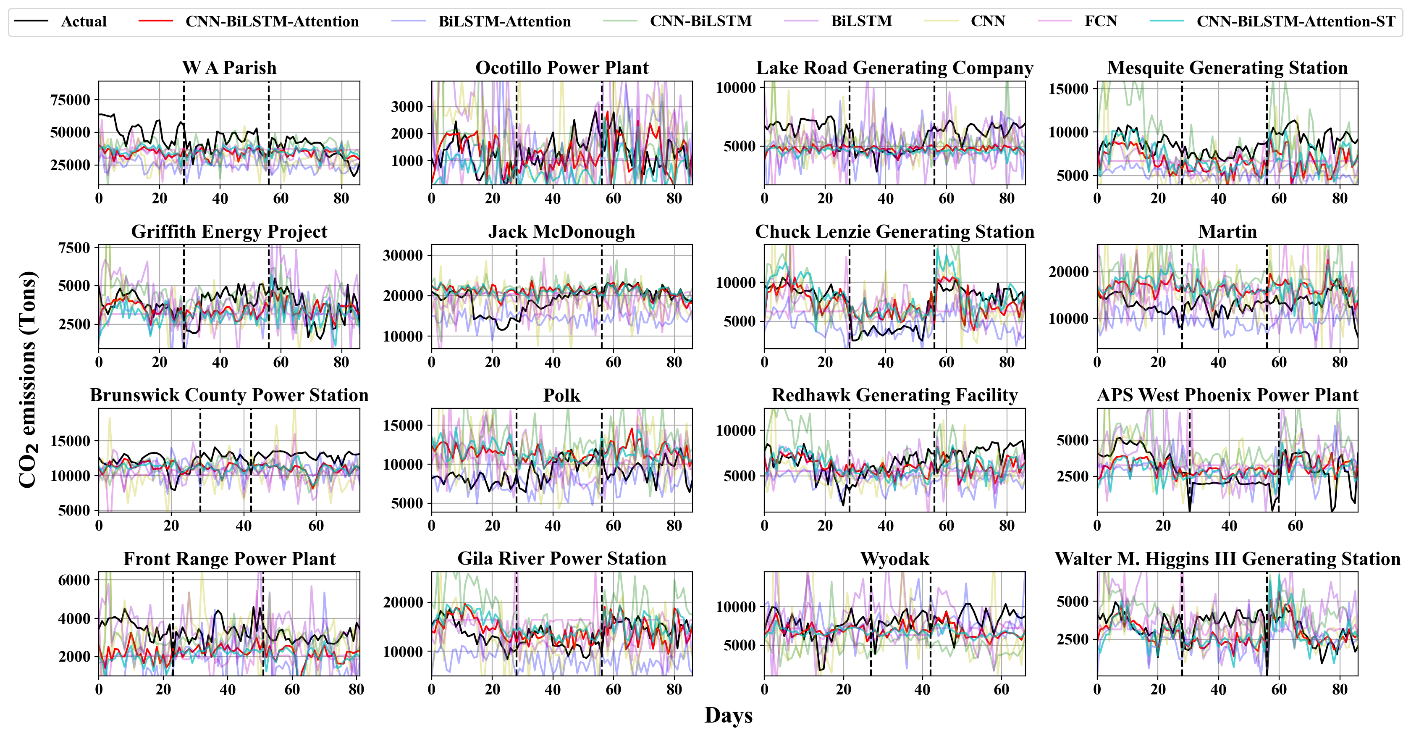 在模型評(píng)估方面,研究從個(gè)體(圖3),區(qū)域,國(guó)家三個(gè)空間尺度驗(yàn)證了所提模型架構(gòu)(CNN-BiLSTM-Attention)的性能優(yōu)越性。以碳排放為例,模型在RMSE、MAPE、R2等關(guān)鍵指標(biāo)上相比傳統(tǒng)方法平均提升10%-14%、5%-7%和16%-25%,在區(qū)域和國(guó)家尺度上亦展現(xiàn)出良好的測(cè)算準(zhǔn)確性。