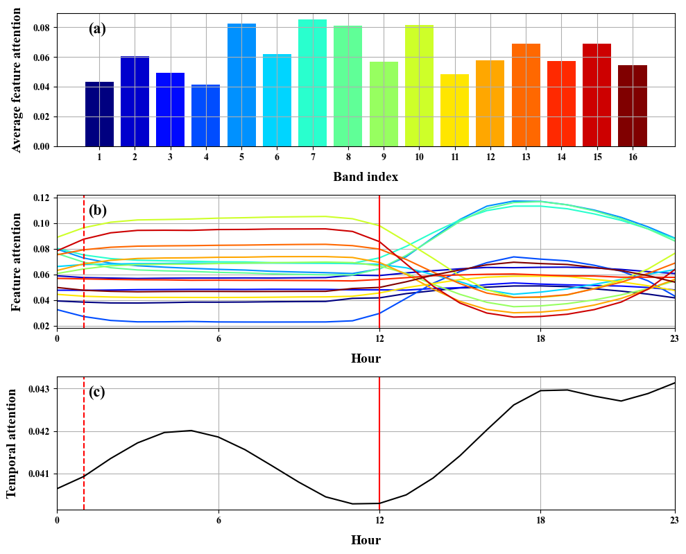 在模型擴(kuò)展應(yīng)用方面,研究首先利用完整衛(wèi)星數(shù)據(jù)對(duì)EPA統(tǒng)計(jì)數(shù)據(jù)進(jìn)行補(bǔ)充評(píng)估,發(fā)現(xiàn)火電廠(chǎng)碳排放和發(fā)電量數(shù)據(jù)存在約10%-25%的潛在記錄遺漏(圖4)。其次,通過(guò)誤差敏感性分析發(fā)現(xiàn),季節(jié)因素和火電廠(chǎng)排放規(guī)模對(duì)模型預(yù)測(cè)精度有顯著影響(圖5)。此外,基于自注意力權(quán)重開(kāi)展的模型可解釋性分析表明,模型高度依賴(lài)編號(hào)為5、7、8和10的波段數(shù)據(jù),這些波段與大氣中的CO?濃度與水汽條件密切相關(guān);同時(shí)模型對(duì)白天信息權(quán)重較高,在夜間則通過(guò)紅外波段數(shù)據(jù)進(jìn)行有效補(bǔ)償(圖6)。