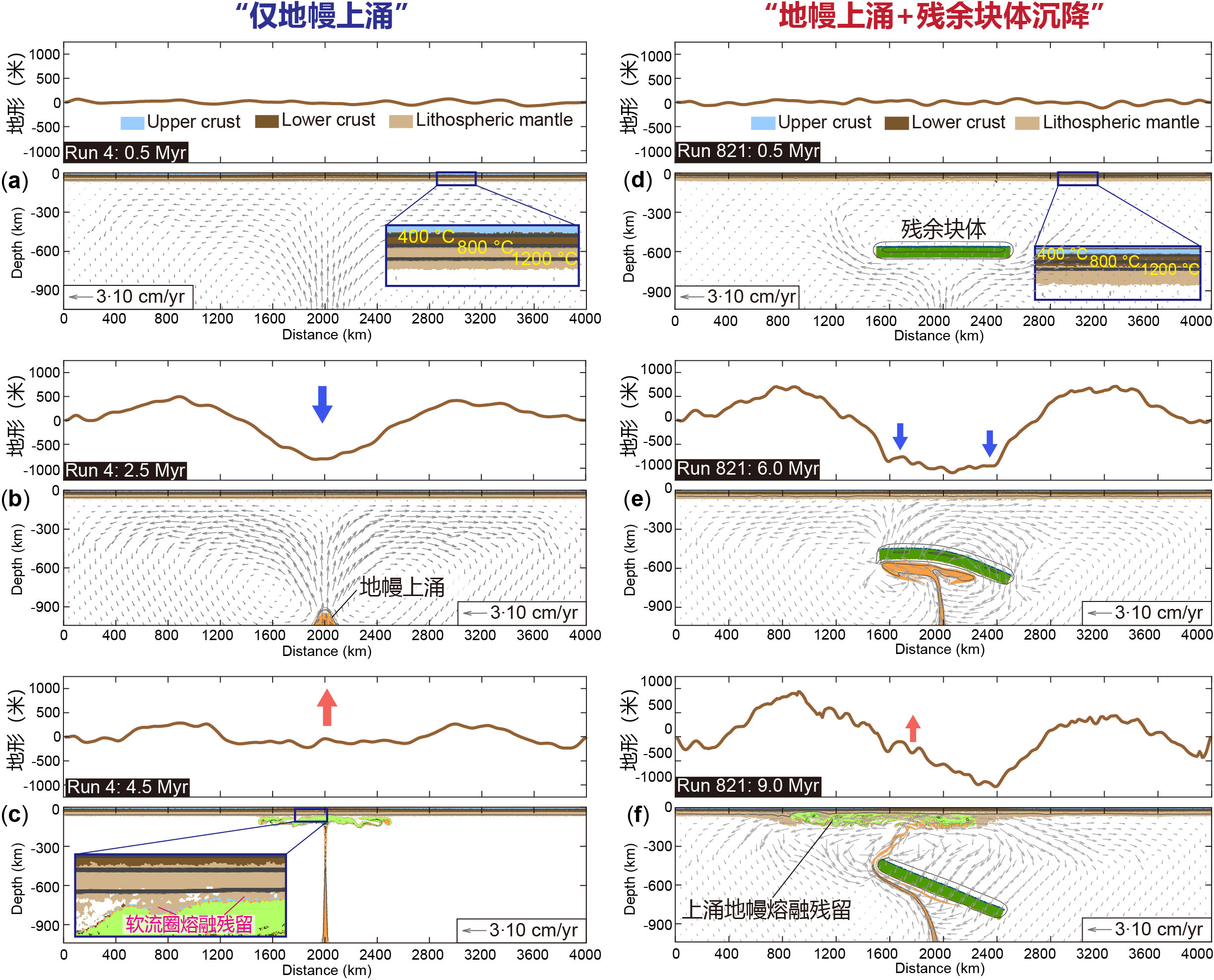 圖2. 代表性數(shù)值模型結(jié)果。(a)-(c)僅地幔上涌的模型。(e)-(f)地幔上涌與沉降殘余塊體共存的模型。團(tuán)隊(duì)測(cè)試過的其他動(dòng)力學(xué)演化過程見文章正文。