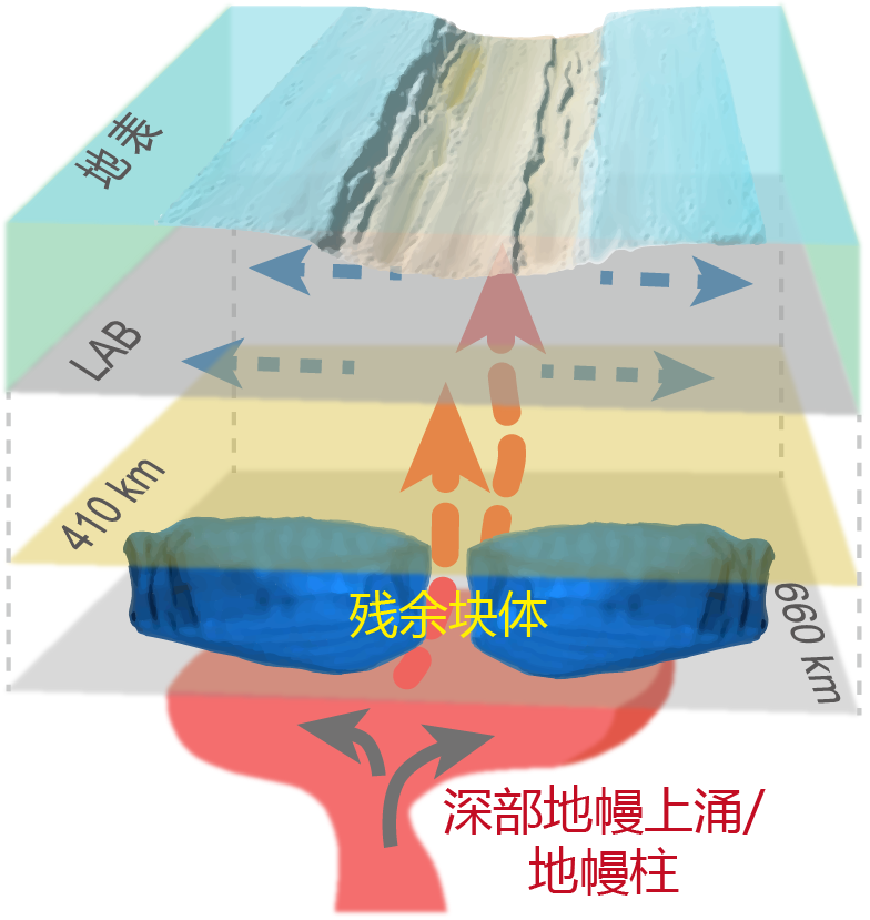 圖3. 殘余塊體對(duì)深部地幔(柱)上涌的透鏡式聚焦效應(yīng)示意圖。