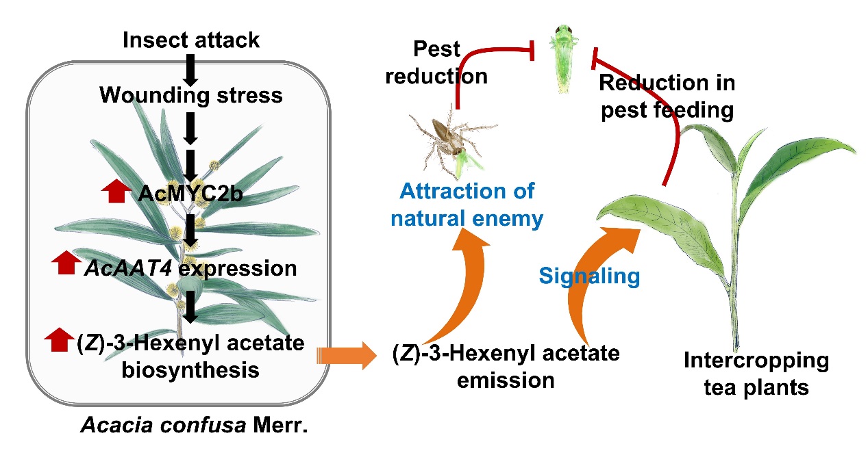 中國科學(xué)院華南植物園科研團(tuán)隊系統(tǒng)解析了茶園常用間作喬木——臺灣相思所釋放的主要揮發(fā)性物質(zhì),明確了(Z)-3-己烯乙酯在調(diào)控茶園節(jié)肢動物行為中的關(guān)鍵作用。通過茶園實驗與室內(nèi)選擇性評價,發(fā)現(xiàn)(Z)-3-己烯乙酯具有驅(qū)避害蟲茶小綠葉蟬及吸引捕食性天敵蜘蛛的雙重作用。進(jìn)一步結(jié)合轉(zhuǎn)錄水平分析、體內(nèi)外功能驗證及轉(zhuǎn)錄調(diào)控等手段,明確AcAAT4為催化(Z)-3-己烯乙酯合成的關(guān)鍵酶,且該基因的表達(dá)受轉(zhuǎn)錄因子AcMYC2b的正向調(diào)控(圖1)。該成果不僅揭示了臺灣相思間作在茶園生態(tài)調(diào)控中的物質(zhì)基礎(chǔ)及其生物合成機(jī)制,也為景觀生態(tài)茶園建設(shè)體系的完善與茶樹優(yōu)質(zhì)高效栽培技術(shù)的提升提供了理論依據(jù)。