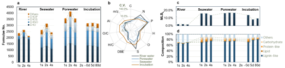 為此,我們采集了典型端元水體(表層、深層海水,濱海紅樹林沉積物間隙水、內(nèi)陸濕地間隙水,以及河水樣品)進(jìn)行方法調(diào)試和驗證?;诋?dāng)前常用的7T 、9.4T和12T FT-ICR MS設(shè)備,本研究比較了多種分辨率調(diào)整策略。這三種磁場強度代表了目前較為普及的儀器類型,研究結(jié)果可為使用不同儀器的研究人員提供優(yōu)化思路,也有助于推動DOM研究方法的標(biāo)準(zhǔn)化和數(shù)據(jù)共享。結(jié)果表明,根據(jù)不同水體來源的特征差異和研究目標(biāo),相應(yīng)的DOM信號調(diào)試策略也不同(圖1)。該研究不僅有效提升了溶解有機質(zhì)的信號(圖2)、增強了不同水體端元(河流、間隙水、海水)指紋圖譜的差異化特征,也提出了在不同分辨率條件下具有可信度的變異系數(shù)區(qū)間(圖3),從而提升了不同實驗室之間信號的可比性。