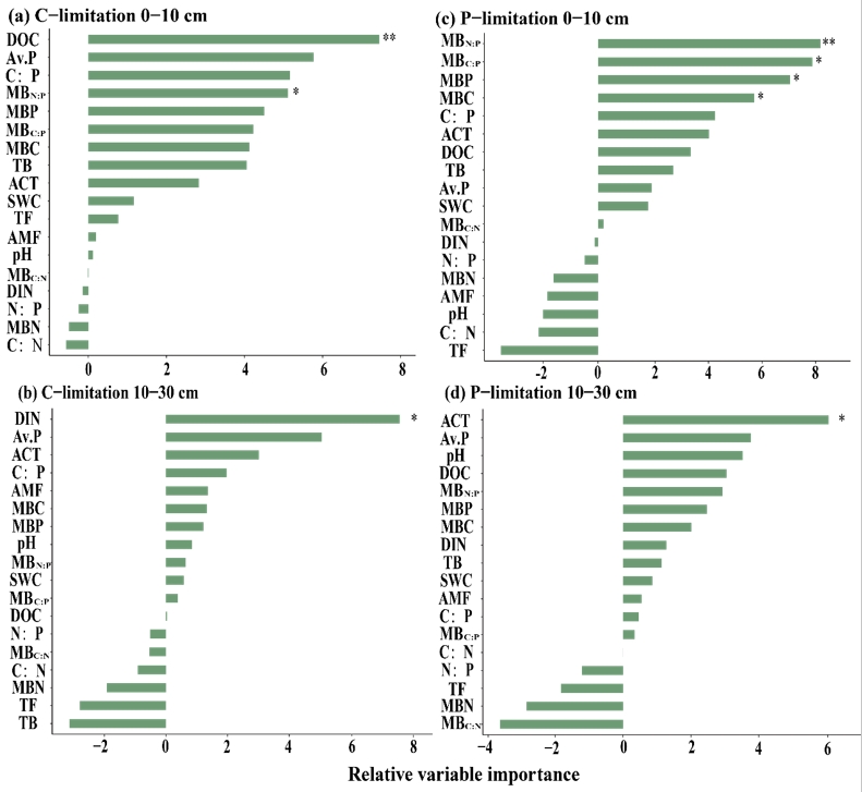 圖2. 不同土層環(huán)境因子對(duì)微生物代謝碳限制和磷限制影響的相對(duì)重要性