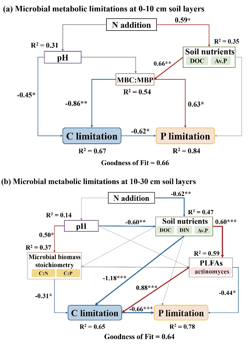 圖3. 氮添加對(duì)表層和深層土壤微生物代謝限制的主要影響途徑