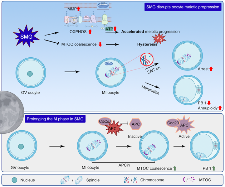 該研究顯示SMG誘導(dǎo)小鼠卵母細(xì)胞獨(dú)特的能量代謝損傷,表現(xiàn)為增加的氧化磷酸化(OXPHOS)與線粒體膜電位超極化,這不同于卵母細(xì)胞在常規(guī)重力下其他暴露所引起的能量代謝損傷,表明微重力與卵母細(xì)胞兩者的特殊性。與此同時(shí),SMG加速減數(shù)分裂進(jìn)程,但延遲了微管組裝中心(MTOC)融合,最終引起卵母細(xì)胞成熟阻滯。該研究針對(duì)加速的減數(shù)分裂進(jìn)程,使用了后期促進(jìn)復(fù)合體抑制劑(APCin)進(jìn)行分裂期延長(zhǎng)。結(jié)果表明延長(zhǎng)分裂期改善了紡錘體組裝與MTOC融合,最終恢復(fù)SMG下卵母細(xì)胞第一極體(PB1)排放情況。該研究為微重力下卵母細(xì)胞成熟與空間雌性生殖提供了理論依據(jù),并為未來開發(fā)空間生殖干預(yù)提供了潛在方案。