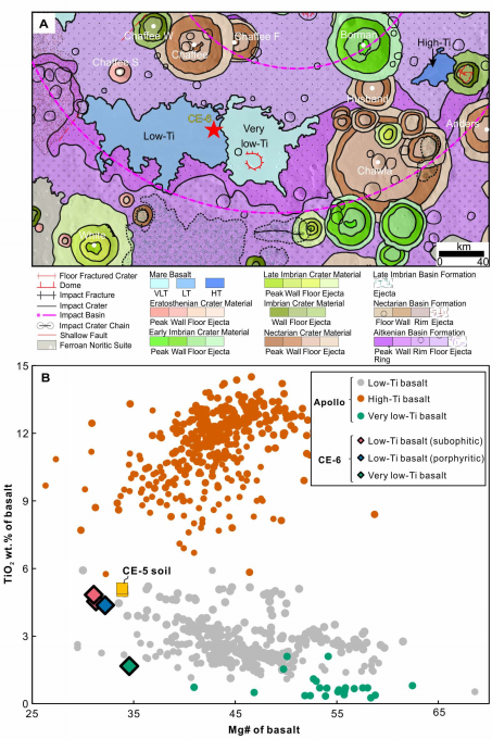 圖1. 嫦娥六號(hào)著陸區(qū)地質(zhì)圖及嫦娥六號(hào)玄武巖Mg#-TiO2成分與阿波羅玄武巖的對(duì)比