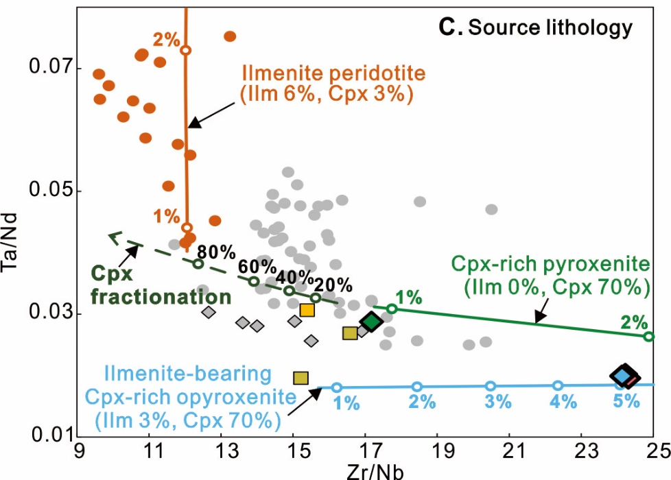 圖3. 微量元素比值Ta/Nd-Zr/Nb模擬嫦娥六號(hào)玄武巖源區(qū)礦物組合