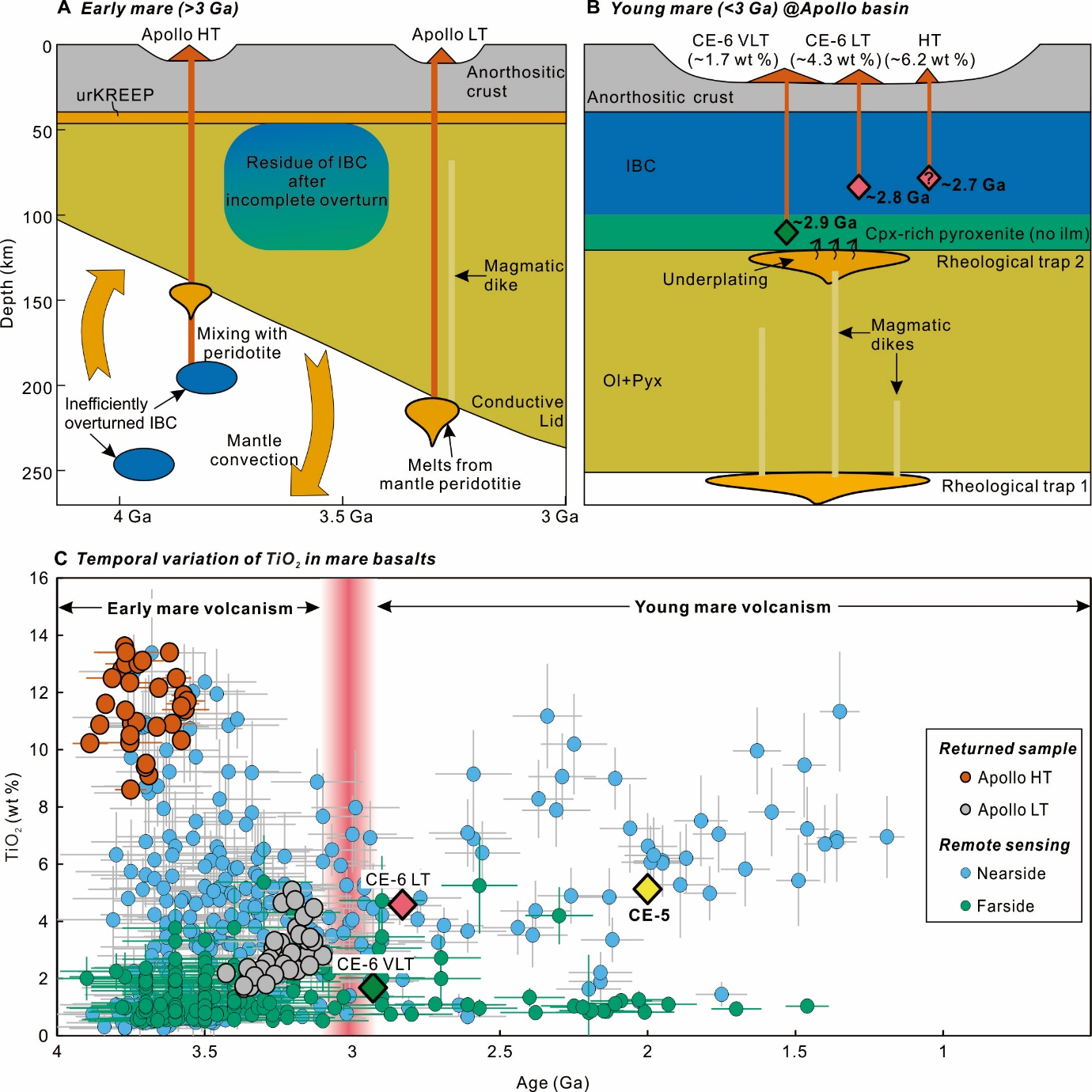 為進(jìn)一步證明該機(jī)制可以適用于全月球火山,研究團(tuán)隊(duì)利用遙感數(shù)據(jù)分析了月球火山活動(dòng)的成分隨時(shí)間的變化,發(fā)現(xiàn)~30億年可能是?月球內(nèi)部熱動(dòng)力的轉(zhuǎn)折點(diǎn)(圖4C):30億年前的玄武巖成分變化沒(méi)有規(guī)律,表明其熱動(dòng)力機(jī)制是多源且復(fù)雜的(如KREEP、潮汐加熱、撞擊等)。30億年之后,熱驅(qū)動(dòng)力變得單一,自下而上的的熱傳輸機(jī)制占據(jù)主導(dǎo)。由于IBC層的流變學(xué)阻擋作用,深部來(lái)源的巖漿不能噴出月表。底墊巖漿的熱傳導(dǎo)致使年輕月球火山活動(dòng)的源區(qū)集中在淺部月幔。此外,由于月幔結(jié)構(gòu)上可能的二分性(正面的IBC相對(duì)背面可能具有更多的鈦鐵礦),使得正背面的年輕火山成分上也出現(xiàn)差異:正面以嫦娥五號(hào)玄武巖類型為主導(dǎo),而背面則以嫦娥六號(hào)超低鈦玄武巖類型的火山活動(dòng)為主。