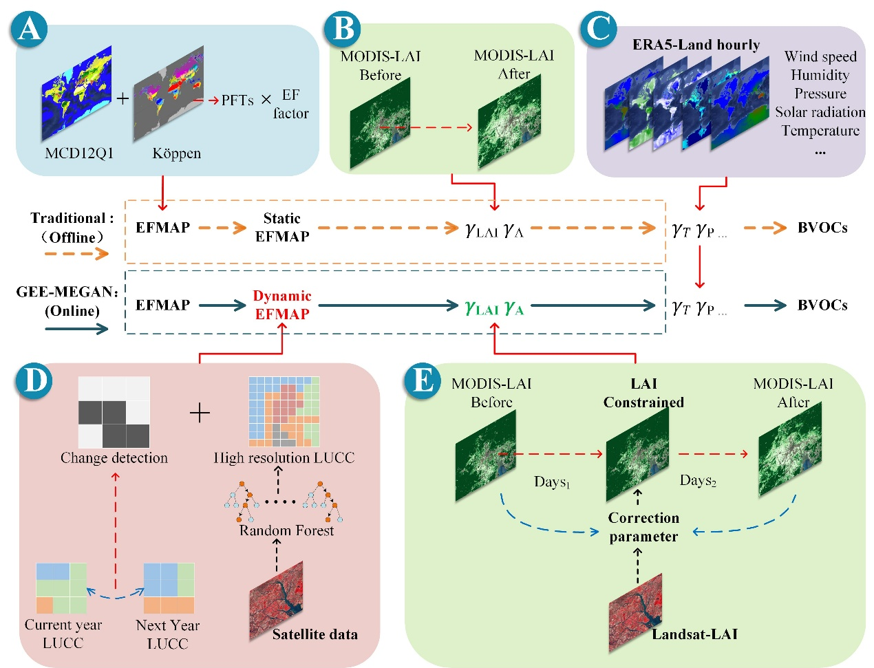 GEE-MEGAN對于廣泛應(yīng)用的MEGAN2.1模型(Alex Guenther教授于2012年開發(fā))做出了重大的改進(jìn)。該模型利用Google Earth Engine(GEE)強(qiáng)大遙感云計(jì)算能力,融合多遙感衛(wèi)星數(shù)據(jù)(如MODIS、Landsat、Sentinel等)和機(jī)器學(xué)習(xí)算法(圖1),改進(jìn)了靜態(tài)的標(biāo)準(zhǔn)排放因子地圖和葉面積指數(shù)(LAI)估計(jì),實(shí)現(xiàn)了10-30米空間分辨率、近實(shí)時(shí)的BVOCs排放模擬,為研究BVOCs排放帶來的空氣質(zhì)量與氣候效應(yīng)提供了有力工具。