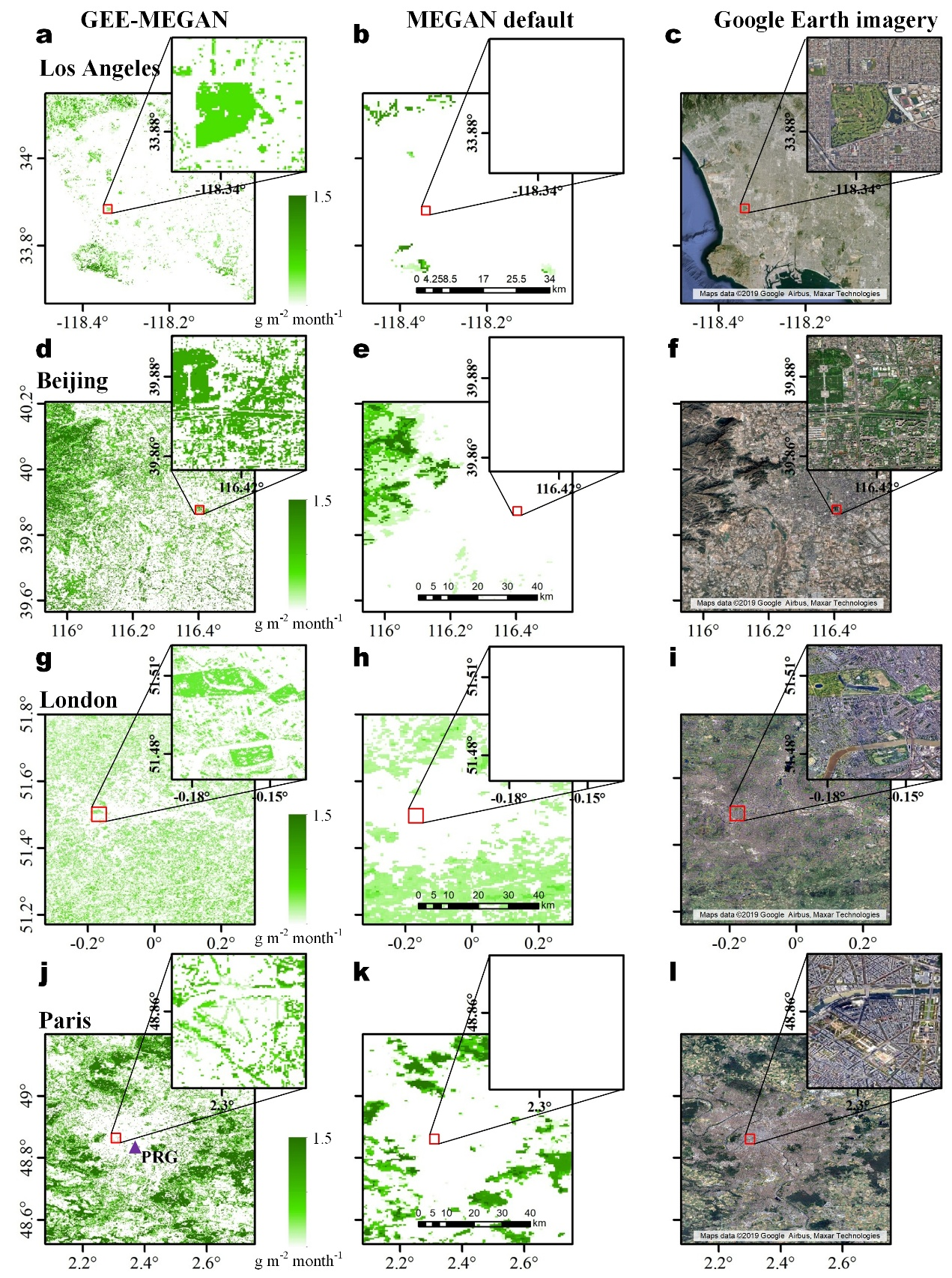 圖2 GEE-MEGAN和傳統(tǒng)MEGAN2.1模型在巴黎、洛杉磯、倫敦和北京針對異戊二烯排放模擬與Google地圖影像植被空間分布的對比
