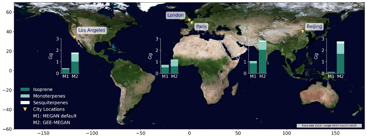 8月28日,由中國科學(xué)院廣州地球化學(xué)研究所王新明研究員團(tuán)隊(duì)張艷利研究員和其博士生冉浩汎,與清華大學(xué)張強(qiáng)教授團(tuán)隊(duì)和加州大學(xué)爾灣分校的Alex Guenther教授合作,開發(fā)的GEE-MEGAN模型為解決這一難題取得了突破性進(jìn)展。GEE-MEGAN以其高時(shí)空分辨率的BVOCs建模,揭示了關(guān)鍵區(qū)域與以往傳統(tǒng)BVOCs模型估算的巨大差異(全球主要城市差異高達(dá)~25倍、在亞馬遜毀林弧相差約80%)。該研究成果以“Improved modelling of biogenic emissions in human-disturbed forest edges and urban areas”為題發(fā)表在《Nature Communications》 期刊。