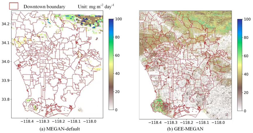 圖5. 洛杉磯GEE-MEGAN與傳統(tǒng)MEGAN模擬BVOCs排放空間分布對比