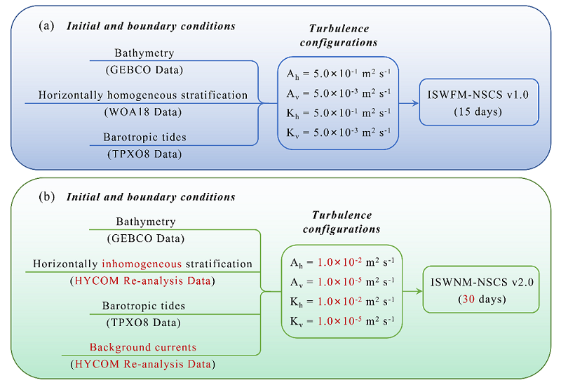 近日,中國(guó)科學(xué)院南海海洋研究所熱帶海洋環(huán)境與島礁生態(tài)全國(guó)重點(diǎn)實(shí)驗(yàn)室海洋環(huán)境模擬與應(yīng)用技術(shù)研究團(tuán)隊(duì)在南海北部?jī)?nèi)孤立波三維數(shù)值模擬研究方面取得新進(jìn)展。團(tuán)隊(duì)推出了南海北部?jī)?nèi)孤立波數(shù)值模型的新版本(ISWNM-NSCS v2.0,圖1),顯著提升了內(nèi)孤立波特征預(yù)報(bào)的精度與穩(wěn)定性。相關(guān)成果以“ISWNM-NSCS v2.0: advancing the internal solitary wave numerical model with background currents and horizontally inhomogeneous stratifications”為題,發(fā)表在《Geoscientific Model Development》期刊上。