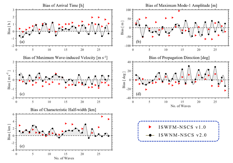 本研究在原有模型ISWFM-NSCS v1.0的基礎(chǔ)上(Gong et al.,2023,GMD),進(jìn)一步引入了背景流場(chǎng)和水平非均勻?qū)踊Y(jié)構(gòu)(圖2),以更真實(shí)地刻畫(huà)內(nèi)孤立波的傳播時(shí)間、垂向振幅、波致流速、半波寬度和傳播方向等關(guān)鍵特征。同時(shí),通過(guò)優(yōu)化水平與垂直方向的黏性和擴(kuò)散系數(shù),在保證模型數(shù)值穩(wěn)定性的前提下,有效延長(zhǎng)了模型的預(yù)報(bào)時(shí)效;基于東沙島附近現(xiàn)場(chǎng)觀測(cè)數(shù)據(jù)對(duì)模型性能進(jìn)行了系統(tǒng)評(píng)估,并開(kāi)展了一系列敏感性試驗(yàn),以分析各項(xiàng)更新的獨(dú)立貢獻(xiàn)。與上一代模型相比(圖3),ISWNM-NSCS v2.0 在內(nèi)波到達(dá)時(shí)間預(yù)報(bào)方面精度提升37%,垂向振幅精度提升34%,波致流速精度提升25%,半波寬度預(yù)報(bào)能力顯著提高85%。