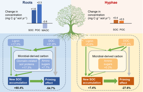 研究結(jié)果表明,根系對土壤有機碳的年均凈貢獻為1.2 mg C g?1土壤,是外延菌絲(0.32 mg C g?1土壤)的近4倍。根系不僅顯著促進新碳的固定,還可抑制原有有機碳的分解,從而實現(xiàn)土壤碳的凈積累。此外,根系輸入主要促進顆粒有機碳(POC)的積累。