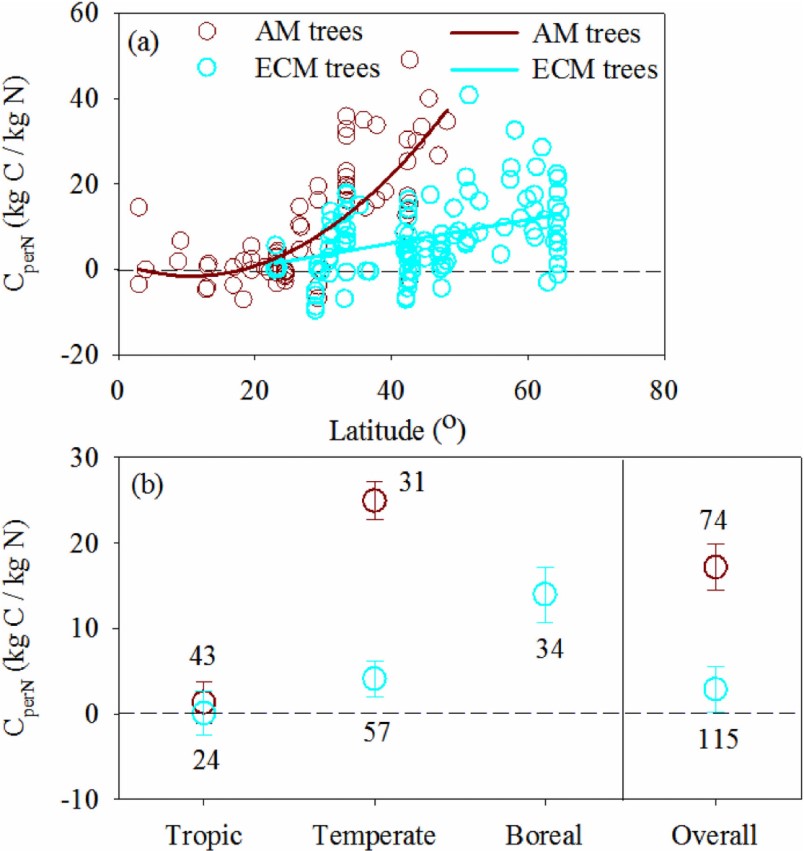 中國科學(xué)院華南植物園鼎湖山站博士后陳國茵、胡苑柳等科研人員,通過整合全球范圍內(nèi)的123項氮添加實驗數(shù)據(jù)(涵蓋71個樹種,189組觀測),深入探究了不同樹種的生物量碳固存對氮添加的響應(yīng)規(guī)律。同時,采用單位氮添加引起的樹木生物量碳增益(CperN)這一指標(biāo),以更準(zhǔn)確地量化氮沉降的碳匯效應(yīng),并利用全球菌根樹木分布圖估算了菌根類型調(diào)控下的全球樹木碳固存潛力。