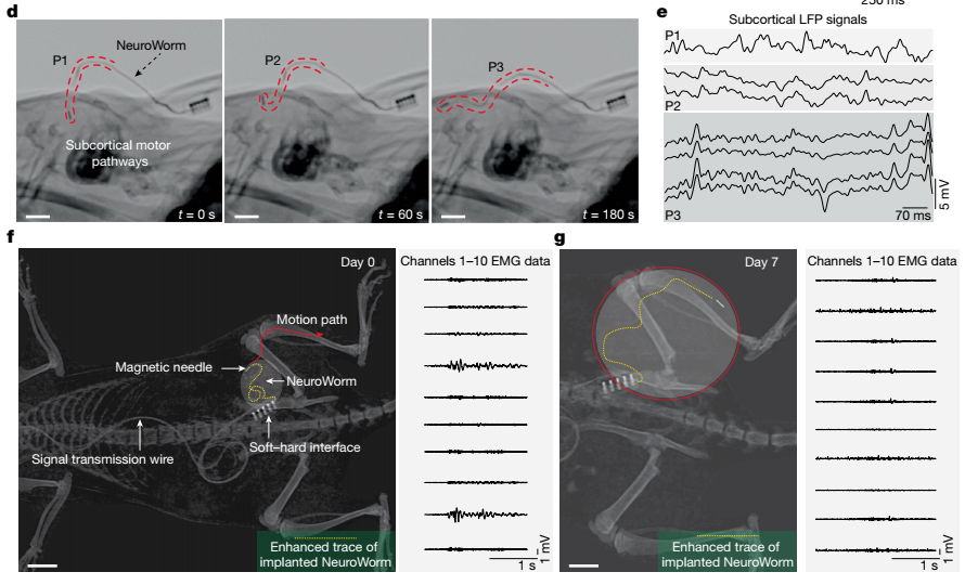與此同時(shí),在外部磁場(chǎng)的操控下,NeuroWorm可在肌肉上表面實(shí)現(xiàn)游走,可在植入后的一周內(nèi)每天變換位置進(jìn)行監(jiān)測(cè)。