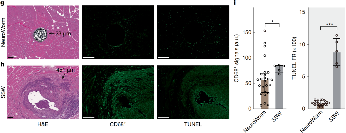 團(tuán)隊(duì)利用微創(chuàng)植入技術(shù),成功實(shí)現(xiàn)了NeuroWorm電極在大鼠腿部肌肉內(nèi)穩(wěn)定工作超過(guò)43周。值得關(guān)注的是,電極植入13個(gè)月后,其周圍形成的纖維包裹層厚度平均不足23微米,周圍組織的細(xì)胞凋亡率與正常組織相當(dāng),展現(xiàn)了優(yōu)異的長(zhǎng)期生物相容性。相比之下,傳統(tǒng)不銹鋼絲電極在相同條件下包裹層厚度超過(guò)451微米,伴隨顯著的細(xì)胞凋亡反應(yīng)。