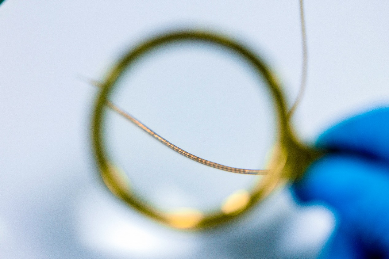 在該研究中,研究團(tuán)隊(duì)首先要解決的難題,便是如何在一根直徑約為200微米的纖維上,布局?jǐn)?shù)十個(gè)獨(dú)立的電極通道,這相當(dāng)于在一根頭發(fā)絲上拆分雕刻出數(shù)十根長(zhǎng)度一致、彼此不能交叉的細(xì)線,還要保證這根纖維足夠柔軟且可拉伸。