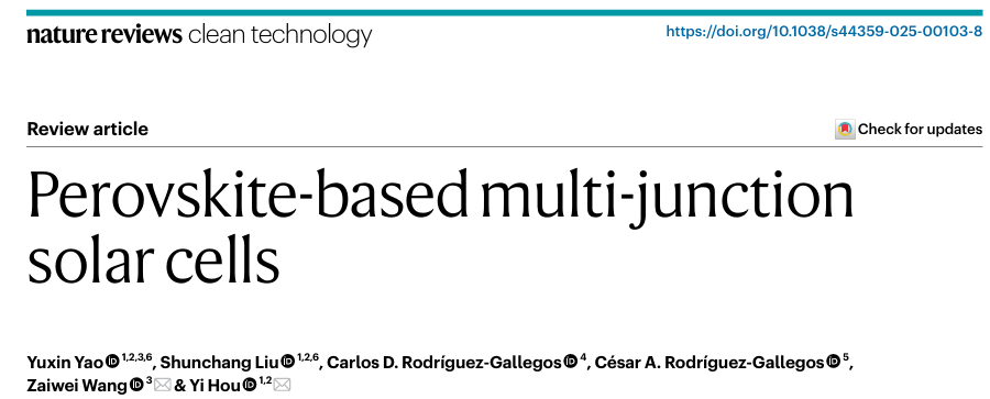 近日,中國科學院深圳先進技術研究院碳中和技術研究所王在偉研究員與新加坡國立大學侯毅教授合作在國際權威期刊Nature Reviews Clean Technology發(fā)表了題為 “Perovskite-based multi-junction solar cells”的綜述性論文[],系統(tǒng)總結了鈣鈦礦基多結太陽能電池的最新研究進展與未來發(fā)展方向。這一成果為推動新一代高效、低成本光伏技術提供了重要的理論依據(jù)和發(fā)展藍圖。