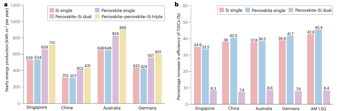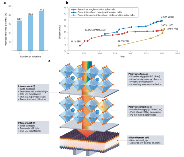 模擬結果顯示,鈣鈦礦-鈣鈦礦-硅三結電池的理論效率可達44.3%,比雙結電池的理論極限(39.5%)高出約5個百分點。在實際氣候條件下,該類三結器件的發(fā)電量比單結電池提升33–46%,比雙結電池高約8%,展現(xiàn)出巨大的應用潛力。