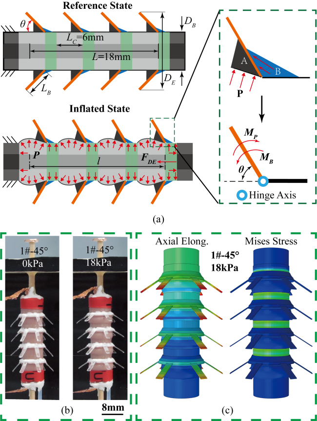 團(tuán)隊(duì)提出了一種DEA與氣動(dòng)單元結(jié)合的高爬行速度、大變徑比且能長(zhǎng)距離爬行的亞厘米級(jí)管道/腔道機(jī)器人。它主體由中心內(nèi)嵌的卷制型DEA、可變形充氣外膽以及24個(gè)彈性鉸鏈鬢毛組成(圖2)。主要亮點(diǎn)如下: