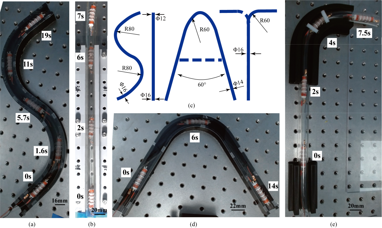 5)高適用性:在沒有優(yōu)化鬢毛材質(zhì)的情況下,機(jī)器人有效行程可達(dá)4m以上,且能通過金屬管道以及復(fù)雜彎曲管道(圖7)。