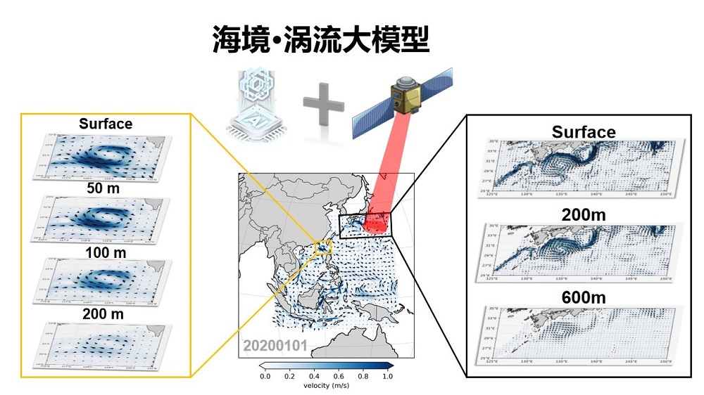針對(duì)這一難點(diǎn),“海境·渦流大模型”應(yīng)運(yùn)而生。它是一款端到端的海洋三維流場(chǎng)智能重構(gòu)大模型,創(chuàng)新性地利用海表高分辨率衛(wèi)星遙感數(shù)據(jù),通過(guò)智能映射技術(shù),實(shí)現(xiàn)對(duì)海洋三維全流場(chǎng)的快速現(xiàn)報(bào)?!昂>场u流大模型”包含兩套流場(chǎng)重構(gòu)方案:①利用海表衛(wèi)星數(shù)據(jù)結(jié)合SwinUnet模型直接重構(gòu)次表層三維全流場(chǎng);②利用海表衛(wèi)星和三維溫鹽數(shù)據(jù)結(jié)合創(chuàng)新開(kāi)發(fā)的SpadeUp模型重構(gòu)次表層三維全流場(chǎng)。方案一能夠有效重構(gòu)上層350米的海表全流,方案二在有三維溫鹽輸入的情況下能夠進(jìn)一步提高混合層之下(到550米)全流場(chǎng)的重構(gòu)精度。