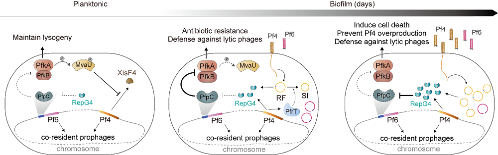 研究團(tuán)隊(duì)發(fā)現(xiàn)Pf4噬菌體核心區(qū)域的復(fù)制相關(guān)蛋白RepG4可直接結(jié)合并降解共存Pf6噬菌體攜帶的三元TA系統(tǒng)KKP中的抗毒素PfpC,從而激活激酶PfkA/PfkB的毒素毒性。當(dāng)Pf4復(fù)制水平達(dá)到一定閾值時(shí),RepG4的積累引發(fā)宿主細(xì)胞受控死亡,從而限制Pf4過度增殖,并協(xié)調(diào)兩種噬菌體在生物膜成熟階段的有序釋放。