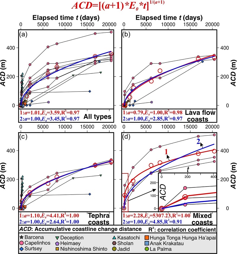 研究團(tuán)隊(duì)對(duì)1952年至2022年間全球12處火山噴發(fā)形成的新生海島海岸開展系統(tǒng)研究,發(fā)現(xiàn)其侵蝕速率普遍呈現(xiàn)“早期快速侵蝕、后期逐漸減緩”的規(guī)律性趨勢(shì)。同時(shí),研究人員利用反冪函數(shù)方程成功實(shí)現(xiàn)了對(duì)該規(guī)律的高精度數(shù)值擬合,并進(jìn)一步發(fā)現(xiàn),當(dāng)依據(jù)海岸巖性類型進(jìn)行分組時(shí),模型擬合精度顯著提升。