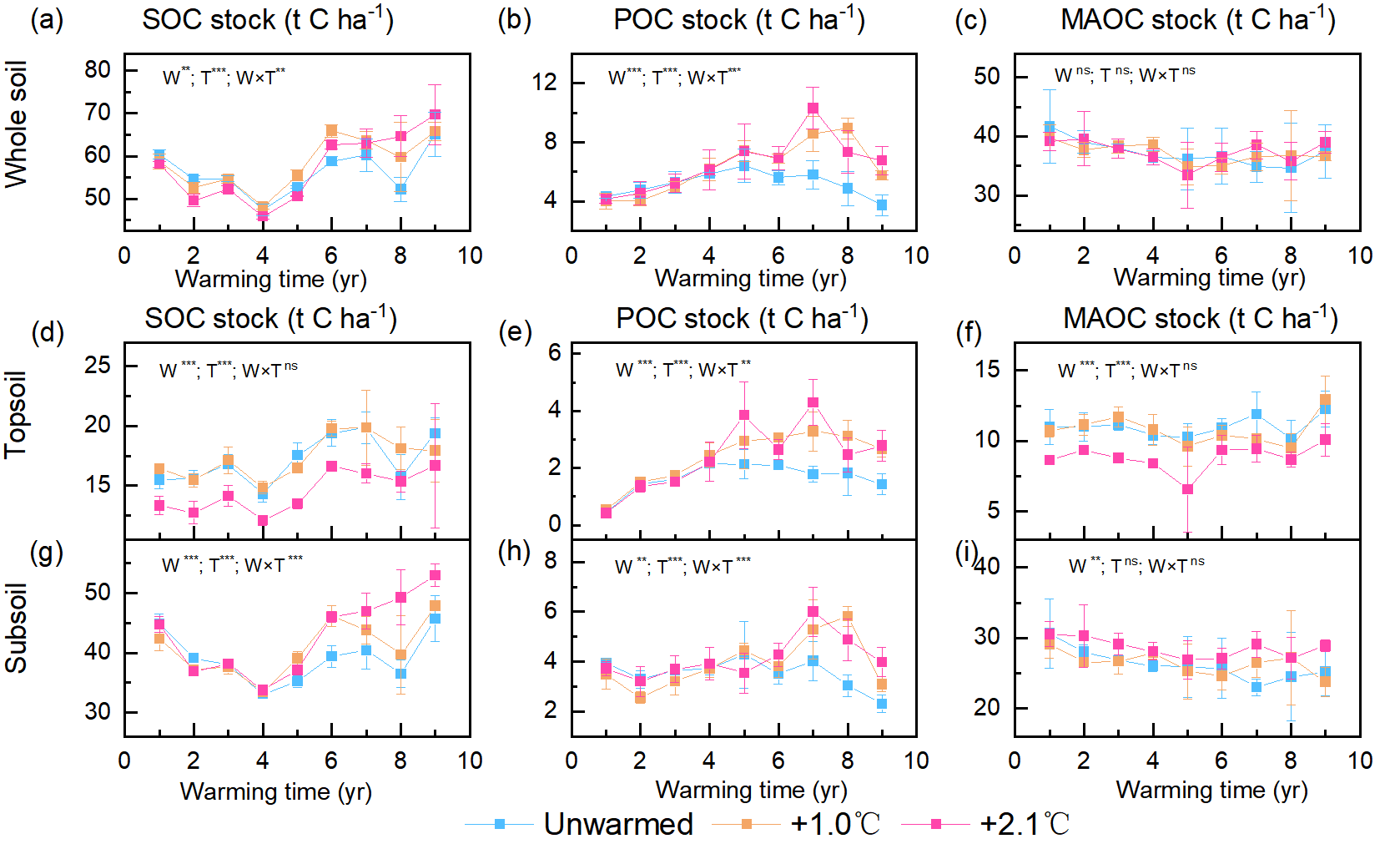 圖1. 增溫對南亞熱帶森林土壤有機碳及其組分的影響