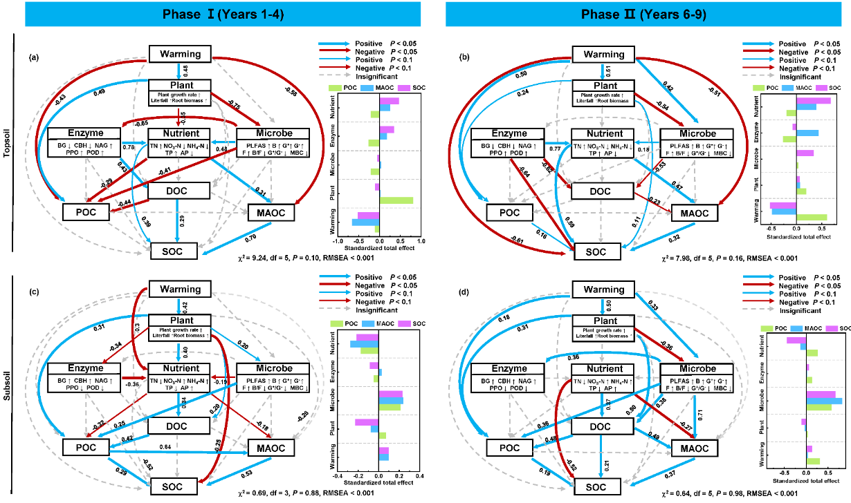 針對這一問題,中國科學院華南植物園鼎湖山站劉菊秀研究員團隊于2012年在鼎湖山站建立了野外生態(tài)系統(tǒng)水平被動增溫實驗平臺(+0°C、+1.0°C、+2.1°C),開展了長期觀測研究。研究發(fā)現(xiàn),土壤不同有機碳組分對增溫的響應受增溫時間的影響。土壤有機碳對增溫的響應呈“兩個階段”(圖1、2和3):在第一階段(1–4年),增溫導致土壤有機碳凈損失,主要由于增溫刺激的植物-微生物養(yǎng)分競爭導致土壤表層礦物結合態(tài)有機碳顯著減少;在第二階段(6–9年),由于持續(xù)的植物碳輸入和微生物碳代謝的熱調整使得植物來源的顆粒有機碳顯著增加,從而導致土壤有機碳的凈積累。這些結果表明,在適度增溫下,一些濕潤的熱帶和亞熱帶森林土壤可能繼續(xù)積累有機碳,挑戰(zhàn)了以往僅基于土壤增溫實驗而得出的結論:即普遍預測未來變暖會使熱帶和亞熱帶森林成為碳源。該研究加深了人們對增溫下植物-土壤相互作用如何驅動亞熱帶森林土壤有機碳長期動態(tài)變化的理解。