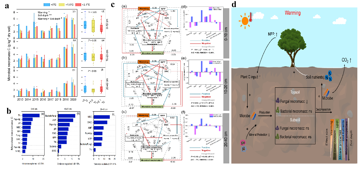 研究人員依托鼎湖山站于2012年建立的生態(tài)系統(tǒng)水平被動增溫實(shí)驗(yàn)平臺,進(jìn)行了為期8年的連續(xù)采樣,分析了南亞熱帶森林土壤微生物殘?bào)w對生態(tài)系統(tǒng)水平增溫的響應(yīng)模式及驅(qū)動機(jī)制。結(jié)果表明,隨著增溫幅度的增加,南亞熱帶森林土壤微生物殘?bào)w下降。與未增溫(+0℃)處理相比,+2.1℃的增溫使表層(0-10 cm)土壤微生物殘?bào)w下降約23%(主要是由于真菌殘?bào)w碳的損失),其約占表層土壤總有機(jī)碳損失的48%。然而,底層土壤(20-40 cm)微生物殘?bào)w碳對增溫的響應(yīng)不敏感。進(jìn)一步分析表明,增溫下表層土壤微生物殘?bào)w碳的損失主要與增溫刺激的植物與微生物氮競爭導(dǎo)致的土壤氮含量降低有關(guān),而底層土壤微生物殘?bào)w對增溫的響應(yīng)不敏感則與底層土壤更強(qiáng)的礦物保護(hù)作用以及更穩(wěn)定的微生物群落有關(guān)(圖1)。