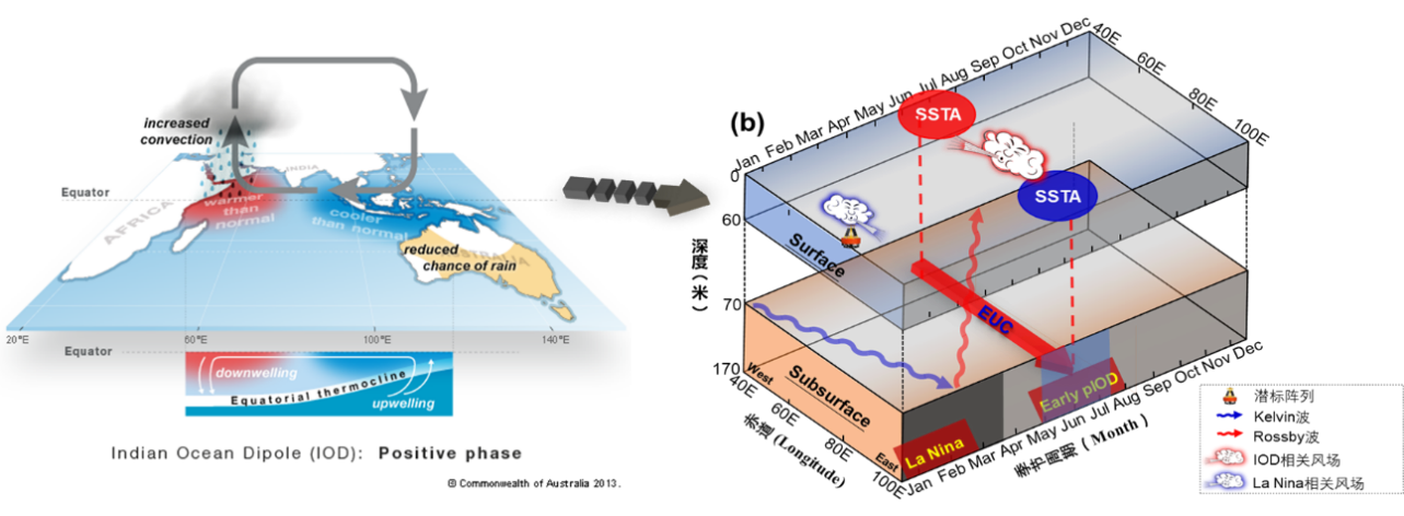 研究團(tuán)隊(duì)基于潛標(biāo)陣列的長期連續(xù)觀測,發(fā)現(xiàn)近幾十年來印度洋EUC在夏季出現(xiàn)了顯著的“再現(xiàn)“趨勢,并進(jìn)一步揭示了其背后的"雙重調(diào)控"機(jī)制。研究表明,印度洋EUC夏季再現(xiàn)受到印度洋偶極子(IOD)多樣性和厄爾尼諾-南方濤動(ENSO)遙強(qiáng)迫的共同調(diào)控。當(dāng)夏季成熟的正IOD事件爆發(fā)時(shí),海氣耦合過程顯著增強(qiáng),形成有利于EUC發(fā)展的耦合動力環(huán)境,讓原本應(yīng)在夏季消失的EUC重新出現(xiàn)在赤道溫躍層。更為意外的是,夏季EUC的再現(xiàn)還與前一年冬季的拉尼娜事件密切相關(guān)。拉尼娜如同EUC的幕后激發(fā)因子,通過激發(fā)赤道海盆波動,沿“海盆傳播—邊界反射—再傳播”的動力路徑,將能量儲存并傳遞至次年夏季,進(jìn)一步促成了EUC的夏季回歸。這一發(fā)現(xiàn)突破了傳統(tǒng)“季風(fēng)控制消失”的認(rèn)識框架,提出了“冬季ENSO—夏季IOD”雙重交織作用的新驅(qū)動機(jī)制。在全球持續(xù)變暖的背景下,熱帶印度洋氣候模態(tài)頻率和強(qiáng)度的顯著變化使得印度洋EUC夏季再現(xiàn)事件趨于頻繁,這將進(jìn)一步重塑印度洋物質(zhì)和能量輸送特征,對鄰近區(qū)域氣候系統(tǒng)和生態(tài)環(huán)境產(chǎn)生更為深遠(yuǎn)的影響。
