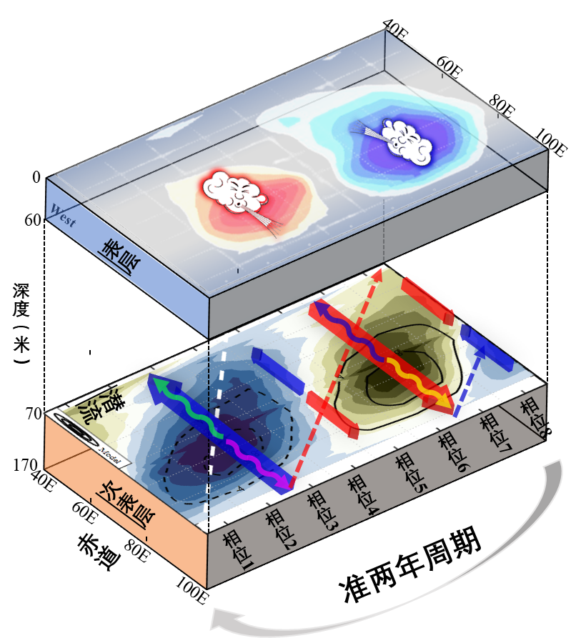 圖2:印度洋偶極子的固有振蕩通過風(fēng)場–溫躍層的耦合作用,驅(qū)動赤道潛流發(fā)生復(fù)雜的位相演變及準(zhǔn)兩年波動響應(yīng)的機(jī)制示意圖