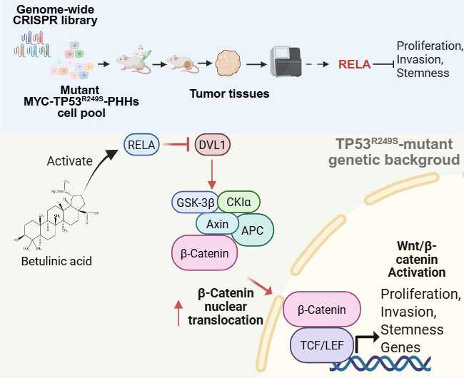 為系統(tǒng)揭示人類(lèi)HCC中的抑癌基因,研究團(tuán)隊(duì)基于CRISPR/Cas9技術(shù),對(duì)過(guò)表達(dá)MYC和TP53R249S的原代人肝細(xì)胞(MT-PHHs)進(jìn)行了異種移植全基因組篩選。篩選結(jié)果顯示,RELA是其中最重要的候選抑癌基因之一。機(jī)制研究表明,在TP53R249S的基因背景下,RELA的缺失會(huì)上調(diào)細(xì)胞周期和干細(xì)胞特性相關(guān)基因,并促進(jìn)上皮間質(zhì)轉(zhuǎn)化(EMT),最終驅(qū)動(dòng)原代人肝細(xì)胞在小鼠模型中原位轉(zhuǎn)化為HCC并促進(jìn)其轉(zhuǎn)移。臨床上,RELA 低表達(dá)與肝細(xì)胞癌患者預(yù)后不良和腫瘤體積較大呈正相關(guān)。在分子機(jī)制層面,RELA表達(dá)降低會(huì)促進(jìn)DVL1的表達(dá),進(jìn)而增強(qiáng)β-catenin的核轉(zhuǎn)位,最終激活致癌的Wnt/β-catenin信號(hào)通路。這一發(fā)現(xiàn)在HCC中明確了NF-κB與Wnt在腫瘤進(jìn)展中的功能性協(xié)同關(guān)系,為理解HCC發(fā)病機(jī)制提供了新視角。此外,RELA的特異性激動(dòng)劑——天然產(chǎn)物白樺脂酸(BetA)能夠有效增強(qiáng)RELA活性,并在異種移植瘤模型中顯著抑制攜帶TP53R249S突變的肝癌細(xì)胞的生長(zhǎng)與轉(zhuǎn)移。這預(yù)示著白樺脂酸或其衍生物有望成為治療TP53R249S突變型HCC的潛在候選藥物。