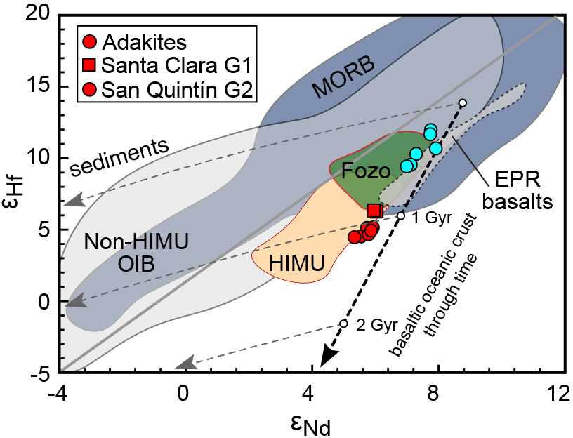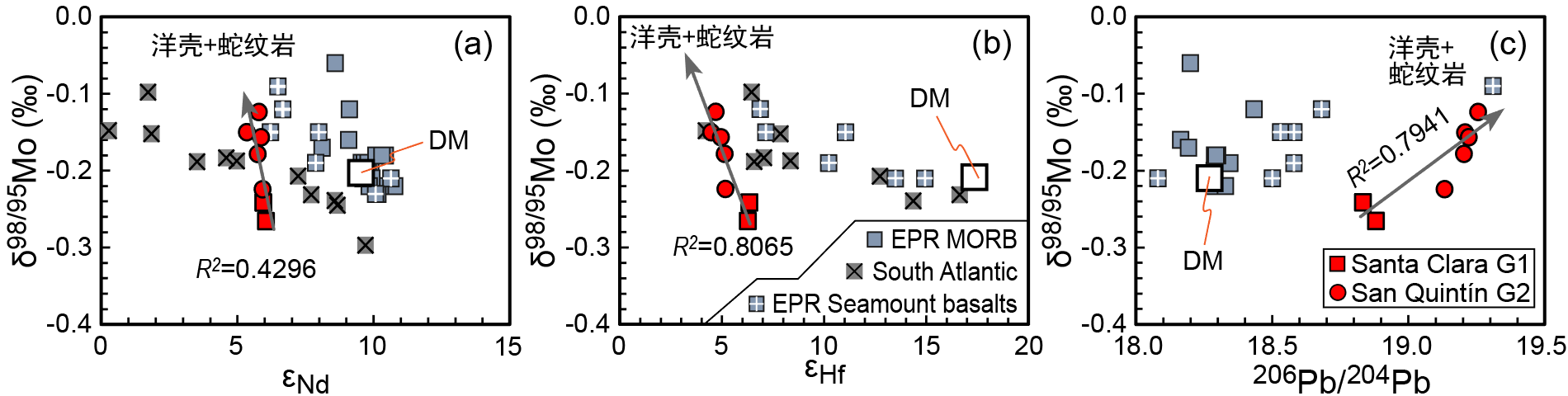 ?中國科學院廣州地化所地幔地球化學學科組劉海泉副研究員、徐義剛研究員、黃小龍研究員,與李杰研究員、張龍副研究員、張樂高級工程師,墨西哥國立自治大學Thierry Calmus教授和圣路易斯波托西自治大學Alfredo Aguillo?n-Robles博士合作,選擇環(huán)太平洋俯沖帶墨西哥下加利福尼亞經(jīng)典的Santa Clara HNB-埃達克巖組合以及San Quintín高鈮玄武巖為研究對象,運用Mo-Sr-Nd-Hf-Pb同位素示蹤手段,揭示了高鈮玄武巖中的古老再循環(huán)洋殼及蛇紋巖組分: