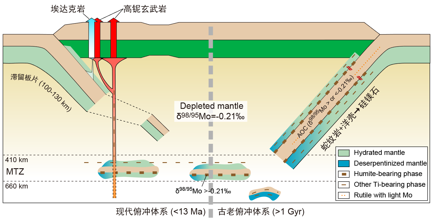 ?3)高鈮玄武巖中Mo同位素的富集與Nd-Hf-Pb同位素變化之間存在協(xié)同變化趨勢(圖2),進一步指示再循環(huán)蛇紋巖化地幔組分對HNB的成因貢獻(圖3)。由于在俯沖帶氧化環(huán)境下,重的Mo傾向于通過熔流體進入地幔楔,殘留洋殼通常具有輕的Mo同位素組成。然而,在板片和地幔楔蛇紋巖還原流體的緩沖下,Mo傾向于不分餾,因而蝕變洋殼的重Mo同位素組成得以保存;同時,板片蛇紋巖流體在上升過程中通過與殘留洋殼反應,可能使殘留洋殼發(fā)生Mo同位素再富集。因此,HNB中重Mo同位素組成可能反映了蛇紋巖流體與再循環(huán)洋殼的相互作用(圖3)。