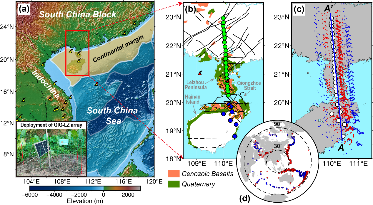 ????地幔柱-巖石圈的相互作用以及被動大陸伸展作用是調(diào)控陸內(nèi)火山活動與巖石圈演化的關(guān)鍵機制,二者協(xié)同作用對巖石圈改造和火山活動的影響仍需深入探討。雷瓊火山區(qū)位于華南陸塊南部被動伸展陸緣,作為晚新生代火山活動強烈的熱點,分布有數(shù)百火山錐和噴發(fā)口。地球物理成像顯示雷瓊火山區(qū)下方低速異??勺缘蒯I畈垦由熘恋蒯\部,但現(xiàn)有研究受觀測系統(tǒng)局限,難以精細刻畫巖石圈厚度、地殼熔融和巖漿系統(tǒng),導致對地幔柱-巖石圈相互作用以及區(qū)域伸展特征的認識存有爭議。例如,此前報道深地震測深顯示雷州半島南部和海南島北部存在地殼減薄,而接收函數(shù)分析結(jié)果顯示為輕微增厚;上地幔的低速異常和殼內(nèi)低電阻率層暗示存在熔融區(qū)域,但缺乏橫向分辨。