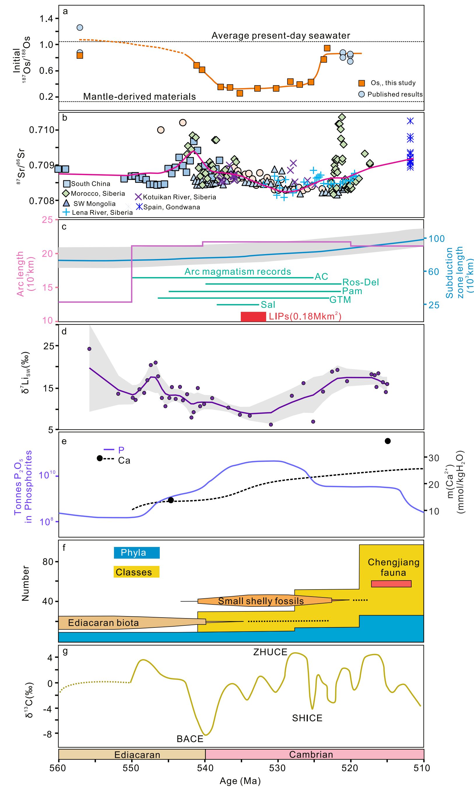 圖1?約560–510 Ma期間的構(gòu)造運(yùn)動、磷塊巖分布、同位素地球化學(xué)記錄(δ13Ccarb-Os-Sr-Li)與生物多樣性模式關(guān)系圖。a:本研究及前人報(bào)道的Os同位素記錄(Xu et al., 2011; Fu et al., 2016);b:匯總的Sr同位素記錄(Derry et al., 1994; Brasier et al., 1996; Kaufman et al., 1996; Kaufman et al., 2007);c:大陸弧長度、俯沖帶長度(Mills et al, 2017)、LIPs (Ernst et al., 2021) 以及弧巖漿活動記錄(Zhu et al., 2012; Brown et al., 2020; Oriolo et al., 2021);d:鉆孔ZK4803碳酸鹽巖樣品的Li同位素記錄。紫色線顯示使用局部加權(quán)散點(diǎn)平滑法得到的最佳估計(jì)曲線,其95%置信區(qū)間以灰色區(qū)域表示;e:?全球尺度磷塊巖礦床估算的P2O5噸位(Cook and Shergold,1984) 以及海水Ca2+濃度演化(Horita e al., 2002;?Brennan et al., 2004);f?:全球范圍內(nèi)的門和綱級生物數(shù)量(Erwin et al., 2011);g:碳酸鹽δ13Ccarb記錄(Zhu et al., 2006)。