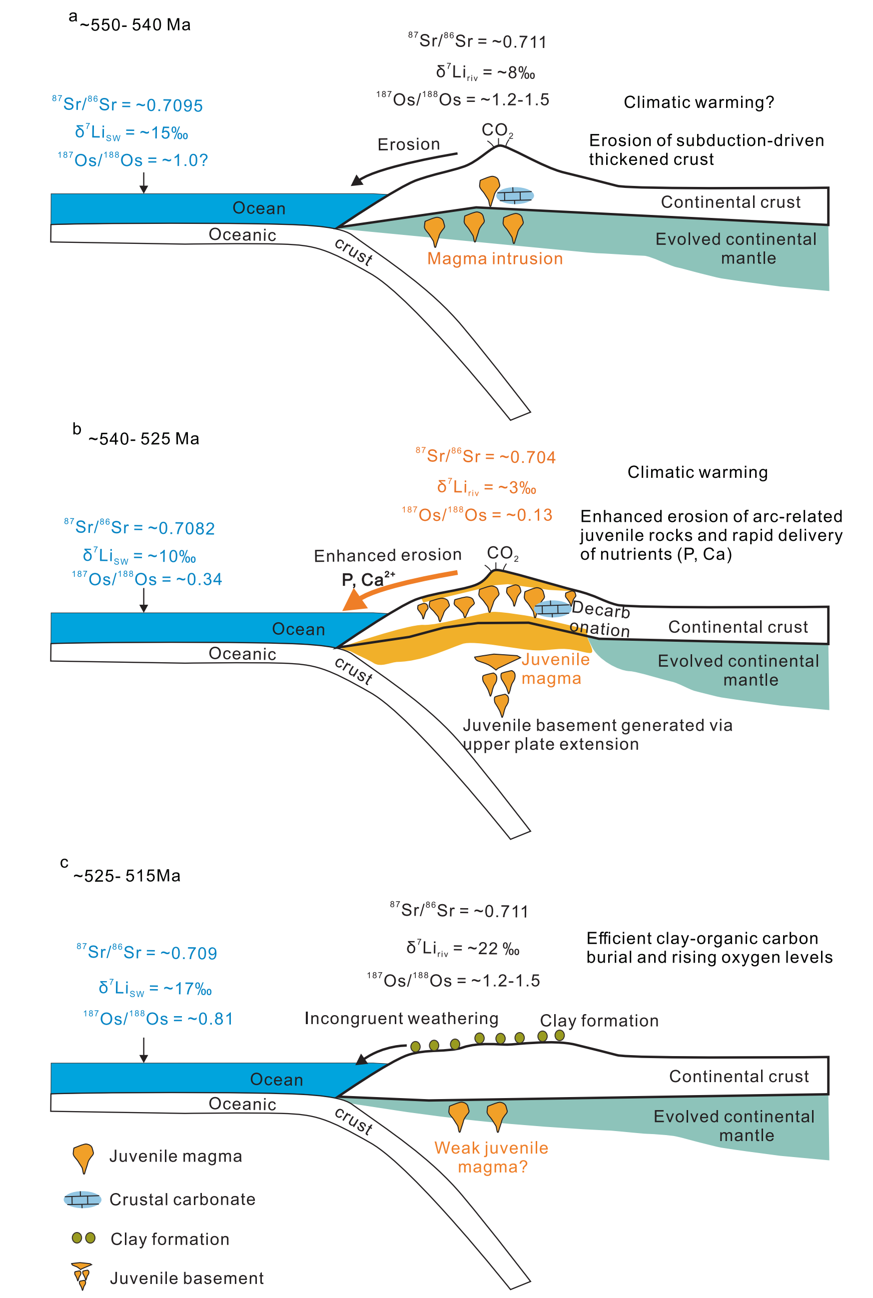 (1)早期地殼增厚階段(約550–540 Ma):俯沖作用導(dǎo)致大陸地殼增厚和氣候變暖,啟動了強(qiáng)烈的風(fēng)化作用。