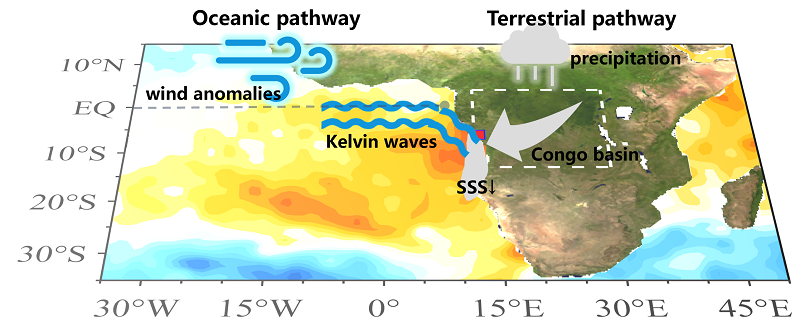 圖1? 正的印度洋偶極子事件對(duì)熱帶東南大西洋沿岸海洋熱浪遠(yuǎn)程影響示意圖。海洋路徑:正IOD事件引起的赤道大西洋西風(fēng)異常激發(fā)海洋開(kāi)爾文波,使TSEA沿岸海域的溫躍層加深,海溫升高,海洋熱浪活動(dòng)增強(qiáng);陸地路徑:正IOD事件發(fā)生使非洲中部降水增加,增強(qiáng)剛果河流量,從而導(dǎo)致TSEA沿海區(qū)域混合層變淺,有利于海溫升高和海洋熱浪發(fā)生。