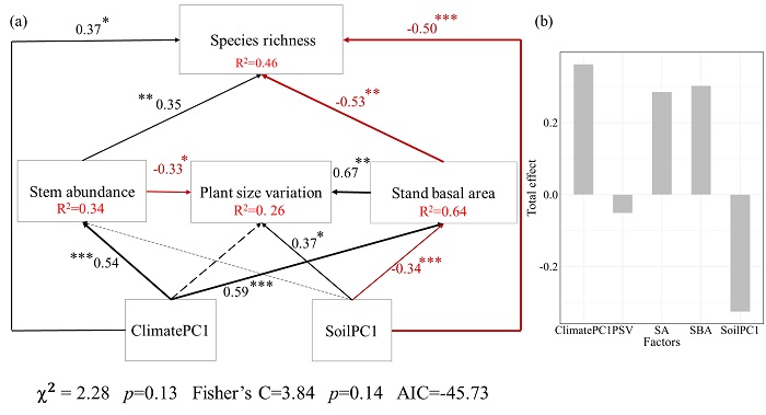 結(jié)果顯示,(1)喀斯特與非喀斯特森林的基巖–土壤環(huán)境存在顯著差異:喀斯特森林的基巖SiO?含量和土壤厚度顯著較低,而土壤中鈣、鎂等元素含量更高。沿緯度梯度變化時,這種富鈣貧硅的基巖-土壤環(huán)境使喀斯特森林的物種多樣性呈現(xiàn)出與傳統(tǒng)模式相反的變化趨勢,即越往高緯度,物種越多、群落越復(fù)雜;(2)結(jié)構(gòu)方程模型分析進一步揭示,氣候?qū)ξ锓N多樣性的正向作用被喀斯特高鈣鎂、淺土層環(huán)境的負向作用所抵消甚至逆轉(zhuǎn),導(dǎo)致物種多樣性“逆緯度梯度格局”的出現(xiàn);(3)喀斯特森林的物種與系統(tǒng)發(fā)育多樣性和基巖SiO?含量、土壤厚度及鈣鎂含量緊密耦合,說明地質(zhì)環(huán)境通過影響土壤化學(xué)組成和水分養(yǎng)分供給,深刻塑造了森林群落的多樣性格局。
