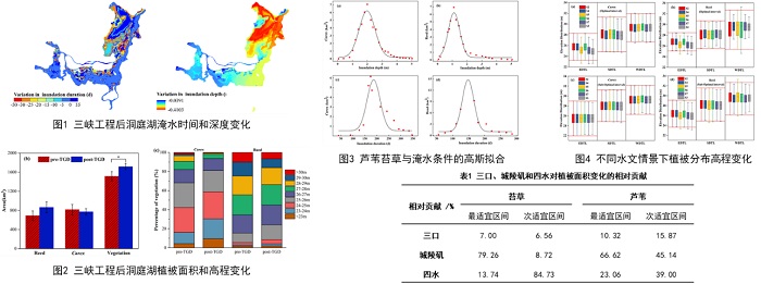 針對這一科學問題,中國科學院亞熱帶農(nóng)業(yè)生態(tài)研究所謝永宏研究員團隊基于長期水文觀測數(shù)據(jù)、遙感影像解譯和MIKE 21水動力模型模擬,對比分析了三峽大壩運行前后洞庭湖淹水格局與植被格局的時空演變特征,并通過設置多種水文情景,首次量化了湖泊入水口與出水口水文條件對植被變化的貢獻。結果表明:(1)三峽大壩運行后,三口年均徑流和城陵磯年均水位均顯著下降,且兩者的年內(nèi)變化特征在大壩運行前后存在差異,其中7-12月較大壩運行前減少,而1-3月增加;(2)洞庭湖平均淹水時間減少9天,平均淹水深度降低0.25米,其中東洞庭湖變化最為顯著;(3)植被面積擴大并向湖心移動,其中蘆葦面積增加且分布高程明顯下移,擠占苔草空間;(4)苔草和蘆葦適宜的淹水時間分別為132–240天和110–186天,表明蘆葦在水位減少條件下競爭優(yōu)勢更強;(5)城陵磯出水口水位下降是洞庭湖植被演替的主要驅(qū)動因素,對比三口四水,城陵磯水文條件對苔草和蘆葦最適宜生長面積的貢獻分別為79.26 %和66.62 %。