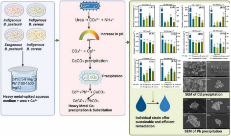 該研究從粵北典型污染土壤中成功篩選出兩種本地礦化細(xì)菌——巴氏芽孢桿菌和蠟樣芽孢桿菌,并與商業(yè)菌株進(jìn)行了系統(tǒng)性對比。研究結(jié)果表明,在低濃度污染條件下(鎘0.5-4.0 mg/L,鉛100-200 mg/L),這兩種本土菌株對鎘和鉛的固定化效率均超過了98%,表現(xiàn)極為高效。即使在較高濃度(如鎘8 mg/L)下,本土巴氏芽孢桿菌仍能保持96%的固化效率,展現(xiàn)出卓越的耐受性。在鎘鉛復(fù)合污染的環(huán)境中,金屬之間存在競爭抑制現(xiàn)象。鉛由于其更強(qiáng)的結(jié)合親和力,往往在固定化過程中占據(jù)主導(dǎo)地位。礦化細(xì)菌誘導(dǎo)形成了富含鎘或鉛的碳酸鹽礦物沉淀,這是固化重金屬的關(guān)鍵機(jī)制。從污染地本土篩選的菌株比外源商業(yè)菌株具有更強(qiáng)的環(huán)境適應(yīng)性和重金屬固化能力,它們能更快地啟動礦化過程,形成更穩(wěn)定的礦物結(jié)構(gòu),為原位生物修復(fù)提供了優(yōu)越的“種子”資源。這項(xiàng)工作不僅從機(jī)理上深化了我們對微生物礦化過程的理解,更重要的是,它為實(shí)際修復(fù)重金屬污染的水體和土壤提供了一種高效、低成本且環(huán)境友好的解決方案。