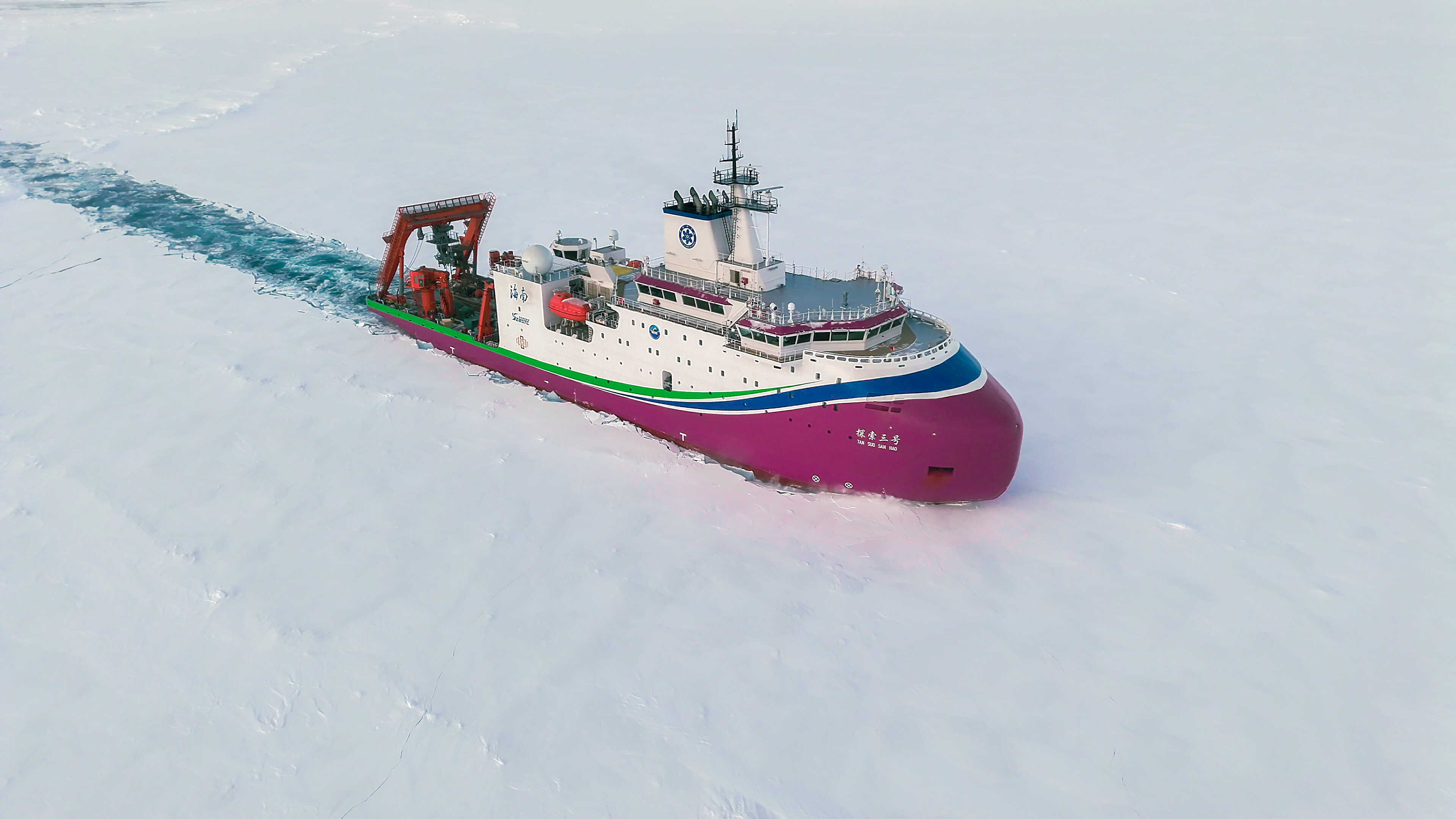 探索三號(hào)”在北極密集冰區(qū)破冰航行