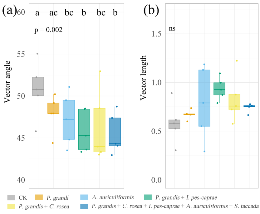 圖2.?熱帶珊瑚島不同植物種植模式下酶矢量特征