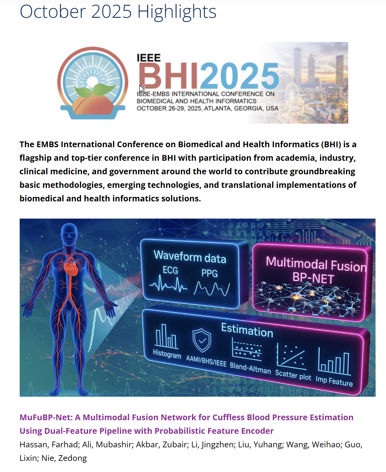 2025年10月,中國科學院深圳先進技術研究院(簡稱“深圳先進院”)聶澤東研究員團隊在 IEEE Journal of Biomedical and Health Informatics(JBHI)發(fā)表了基于ECG與PPG的動態(tài)血壓監(jiān)測研究 “MuFuBP-Net: A Multimodal Fusion Network for Cuffless Blood Pressure Estimation Using Dual-Feature Pipeline With Probabilistic Feature Encoder”(Highlights文章),并以配圖形式登載于 JBHI October 2025當期封面。