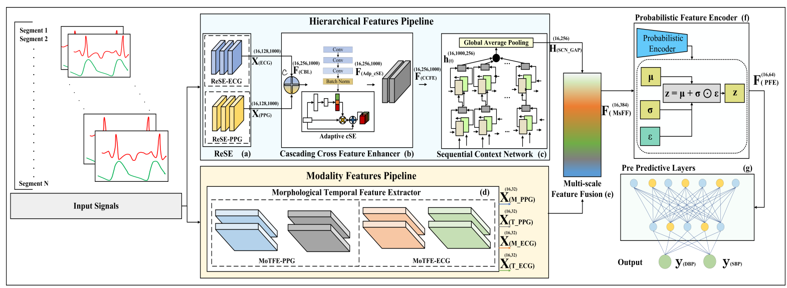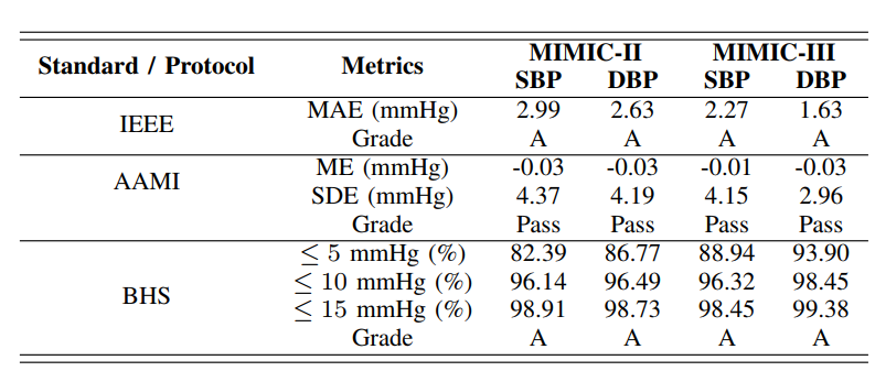 在研究中,團隊提出了一種全新的多模態(tài)融合網(wǎng)絡模型MuFuBP-Net,用于基于 ECG 與 PPG 的無袖帶血壓估計。模型采用雙特征提取通道架構,分別進行分層與模態(tài)特征建模;引入 Cascading Cross-Feature Enhancer(CCFE) 跨模態(tài)融合與通道注意機制,動態(tài)調節(jié)時空特征的重要性;基于變分思想設計 Probabilistic Feature Encoder(PFE),對高維融合特征進行緊湊建模與去冗,從而提升泛化能力與魯棒性。在 MIMIC-II 與 MIMIC-III 數(shù)據(jù)庫上,所提出的模型在收縮壓(SBP)評估中達到MAE ± SDE ≤ 2.99 ± 4.37 mmHg,舒張壓(DBP)評估中達到MAE ± SDE ≤ 2.63 ± 4.19 mmHg ,結果優(yōu)于國內外同類模型,并符合 AAMI、BHS、IEEE 三大國際標準的 A 級要求。研究同時引入 LIME 可解釋性分析,驗證 ECG 在血壓預測中的關鍵作用,并通過多組消融實驗進一步確證模型設計的有效性與創(chuàng)新性。